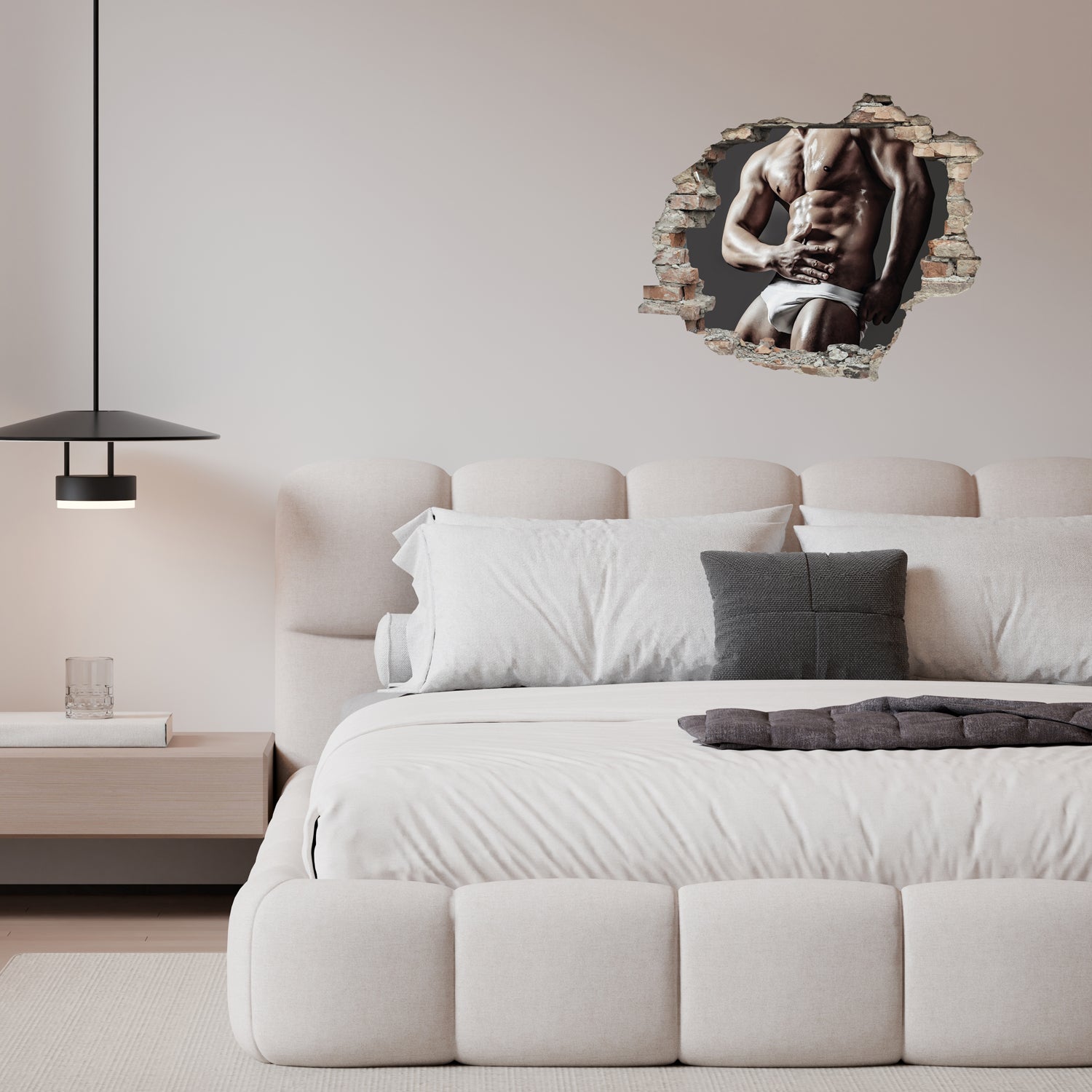 Bringen Sie pure Motivation und Ästhetik direkt an Ihre Wand! Unser 3D-Wanddurchbruch mit Sixpack-Motiv erzeugt die perfekte optische Täuschung: Es wirkt, als würde die Wand aufbrechen und den Blick auf einen perfekt definierten, maskulinen Oberkörper freigeben.